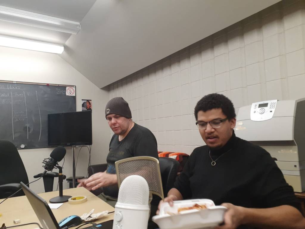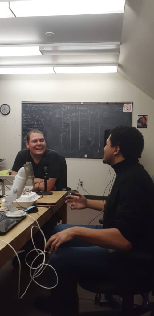 Clint and I setting up before recording for “Untitled Podcast” (2020).